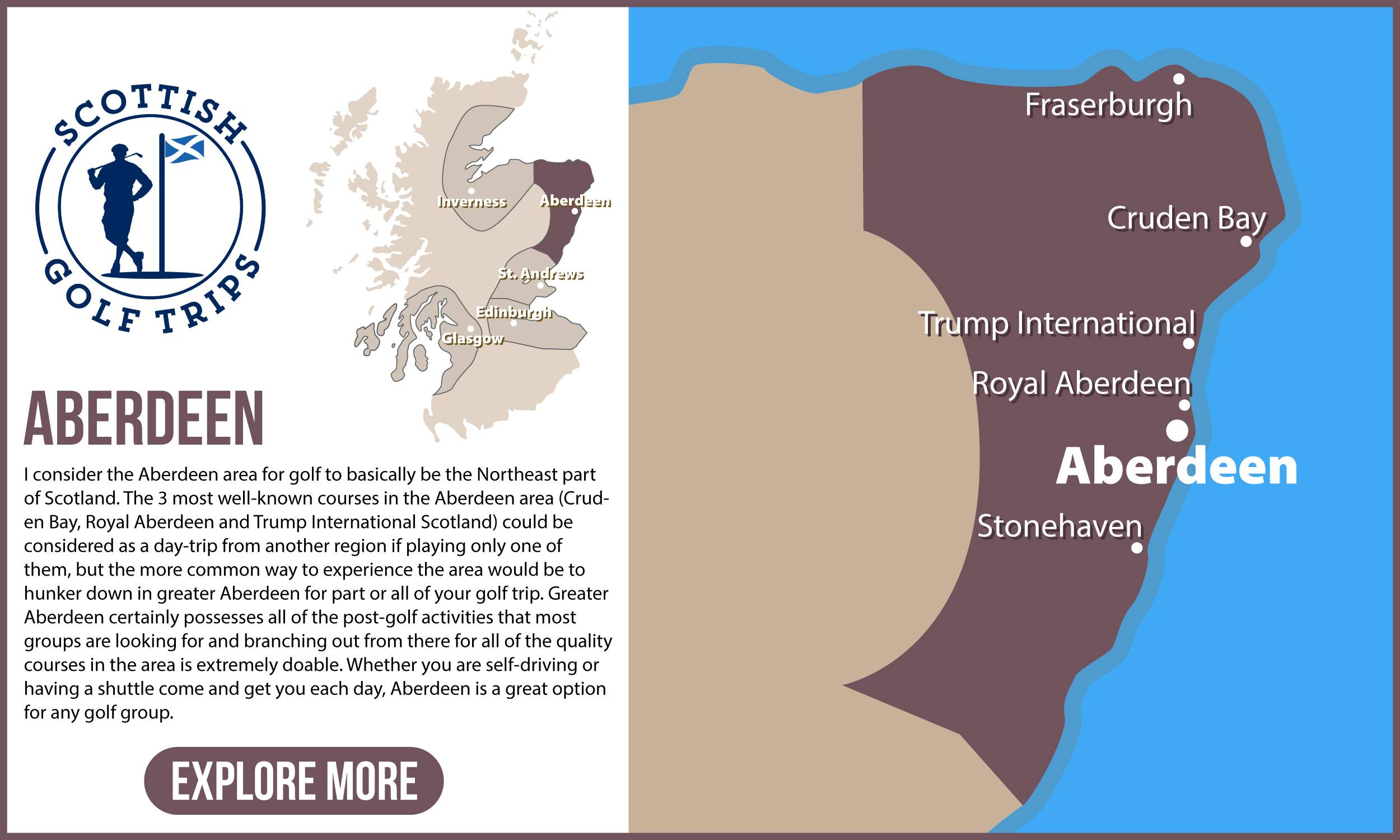 I consider the Aberdeen area for golf to basically be the Northeast part of Scotland. The 3 most well-known courses in the Aberdeen area (Cruden Bay, Royal Aberdeen and Trump International Scotland) could be considered as a day-trip from another region if playing only one of them, but the more common way to experience the area would be to hunker down in greater Aberdeen for part or all of your golf trip. Greater Aberdeen certainly possesses all of the post-golf activities that most groups are looking for and branching out from there for all of the quality courses in the area is extremely doable. Whether you are self-driving or having a shuttle come and get you each day, Aberdeen is a great option for any golf group.