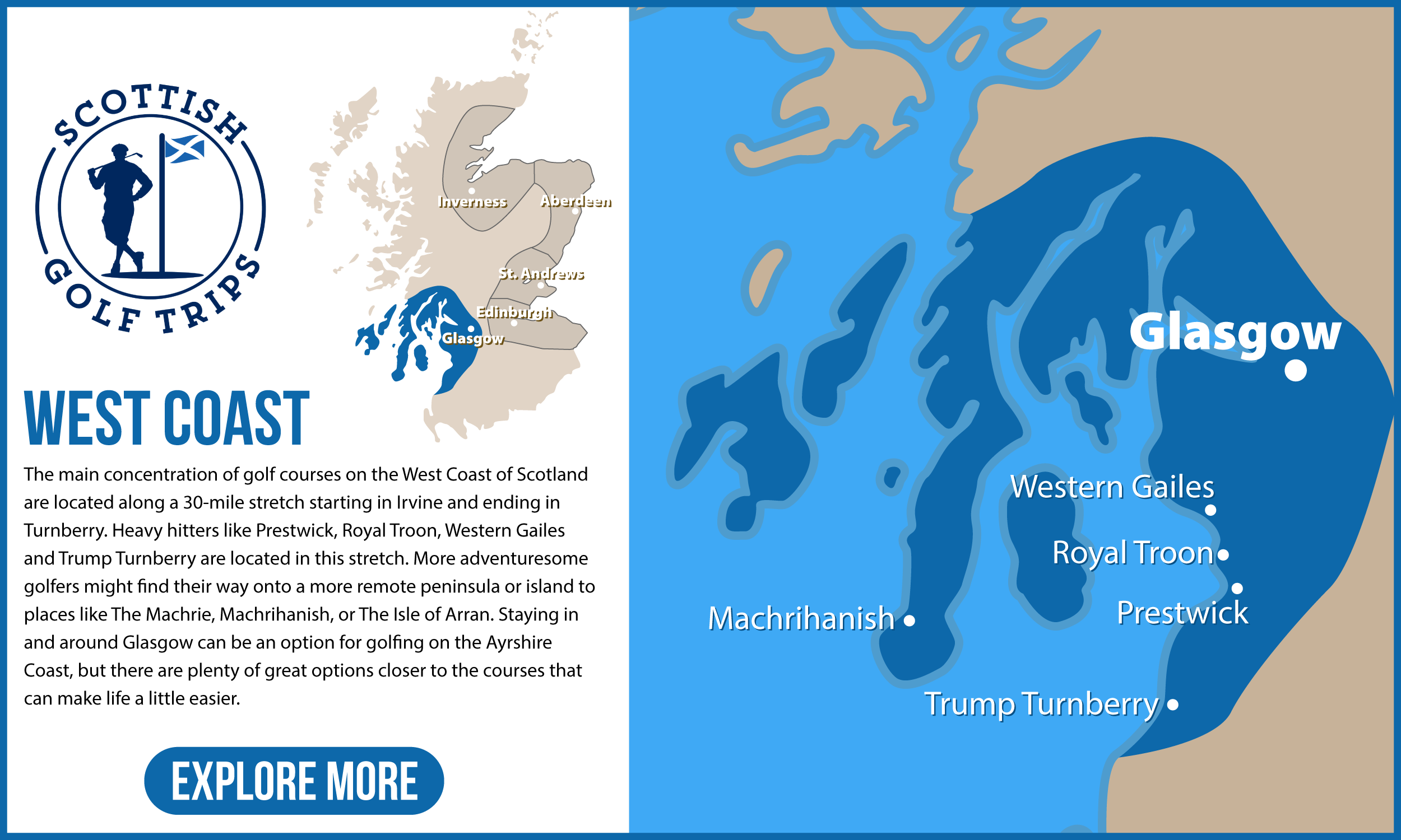 The main concentration of golf courses on the West Coast of Scotland are located along a 30 mile stretch starting in Irvine and ending in Turnberry. Heavy hitters like Prestwick, Royal Troon, Western Gailes and Trump Turnberry are located in this stretch. But some more adventuresome golfers will find their way onto a more remote peninsula or island (that might take a little more effort) to find their way to places like Machrihanish, The Machrie, or so and so. Staying in and around Glasgow can be an option for golfing on the Ayrshire Coast, but there are plenty of great options closer to the courses that can make life a little easier.